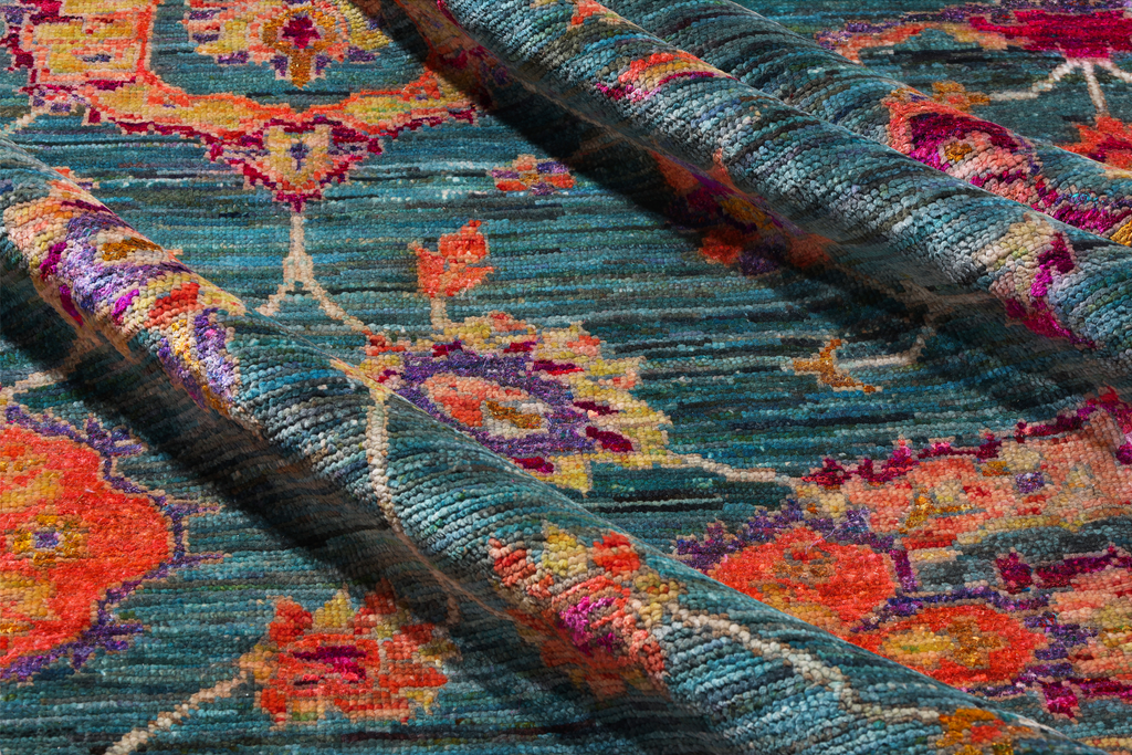 Our Anga rug boasts a refined and contemporary take on traditional palace gardens, rendered in a punchy, colourful palette.