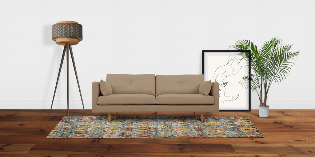 Our Toulouse carpet, an easy way to cosy up any space with hues of Azure, Rose and Deep Crimson on a warm, earthy base.