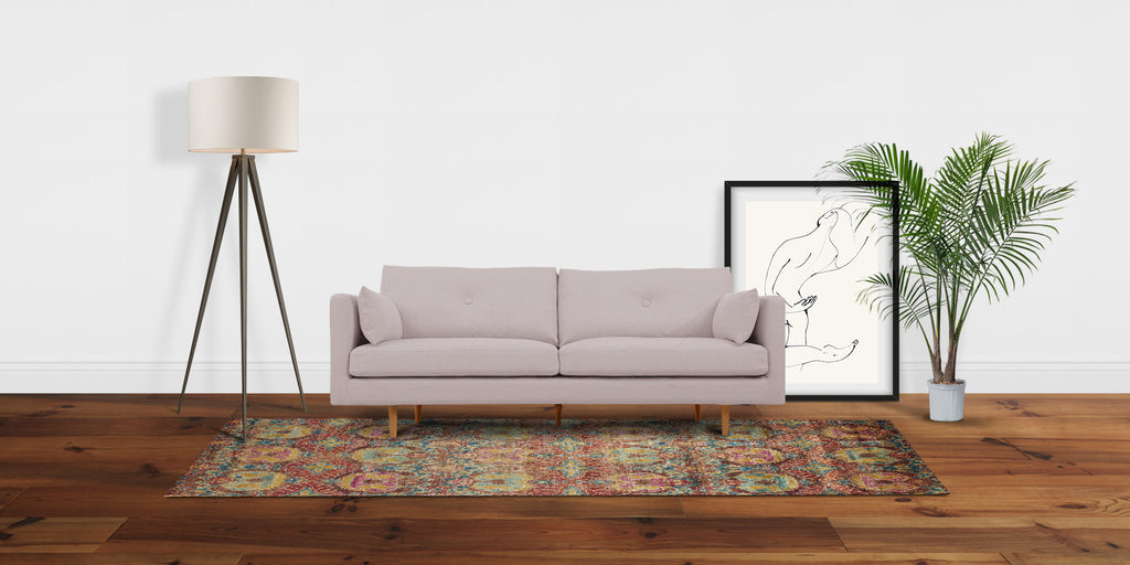 Our Toulouse carpet, an easy way to cosy up any space with hues of Azure, Rose and Deep Crimson on a warm, earthy base.