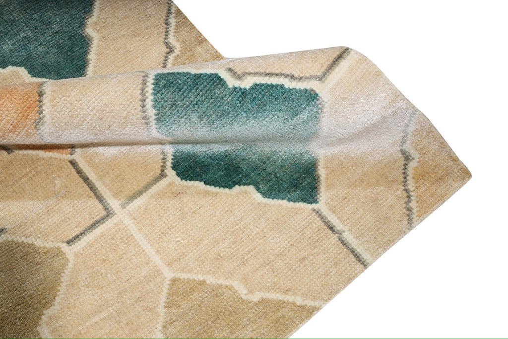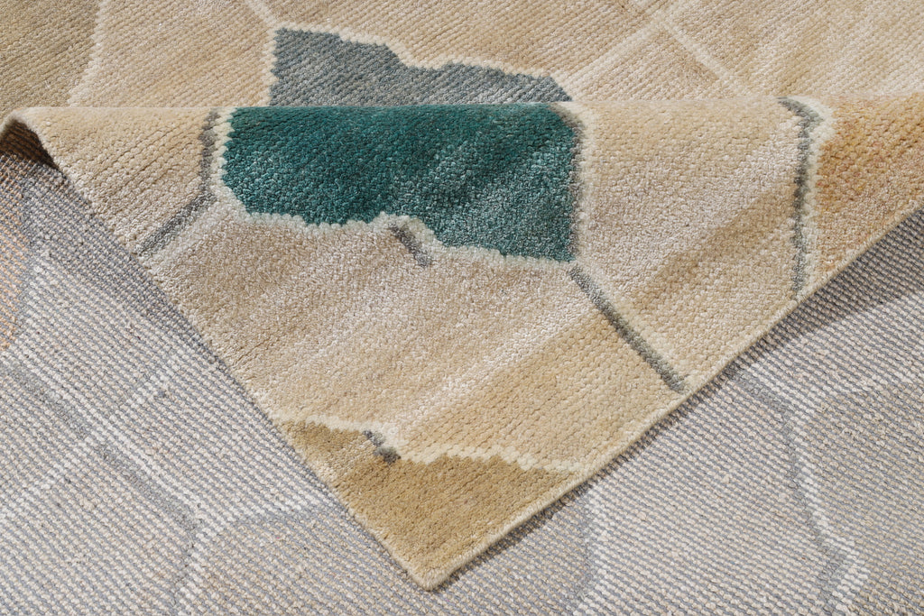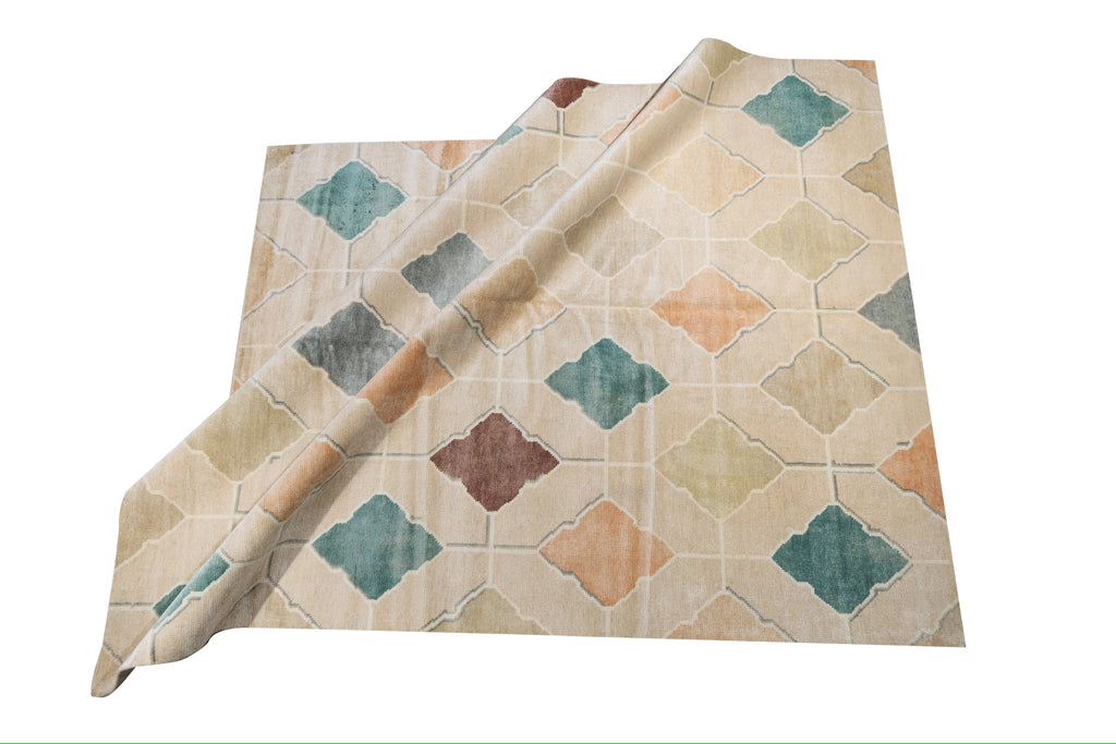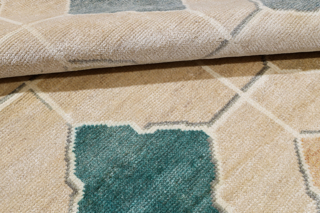 Our Zellige rug boasts a refined and contemporary take on traditional Moroccan zellige tilework, rendered in a soft, earthy palette. Diamond shaped patterns with clipped corners anre arranged in a symmetrical grid across a warm, neutral background.