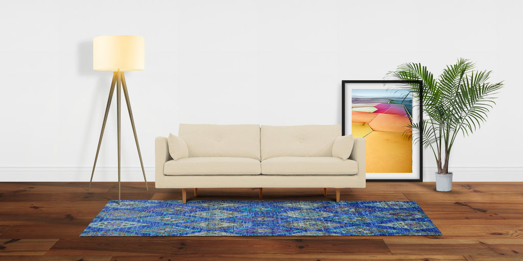 Inspired by patterned kites flying and skipping through the sky, our Kaza carpet in Ultramarine Blue gives geometric a whole new perspective.