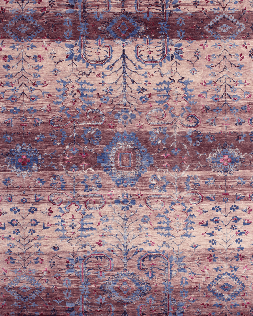 With fragile floral inlays of the perfect Steel Blue, offset with sprinkles of Jewel Rose, our Soma carpet in Roseate Wood is a jewel-toned gem.